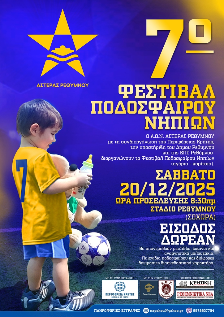 Τα πάντα είναι έτοιμα για την διενέργεια του 7ου Φεστιβάλ Ποδοσφαίρου Νηπίων που θα πραγματοποιηθεί το Σάββατο 20 Δεκεμβρίου 2025 στο Δημοτικό Στάδιο Ρεθύμνου (Σοχώρα).